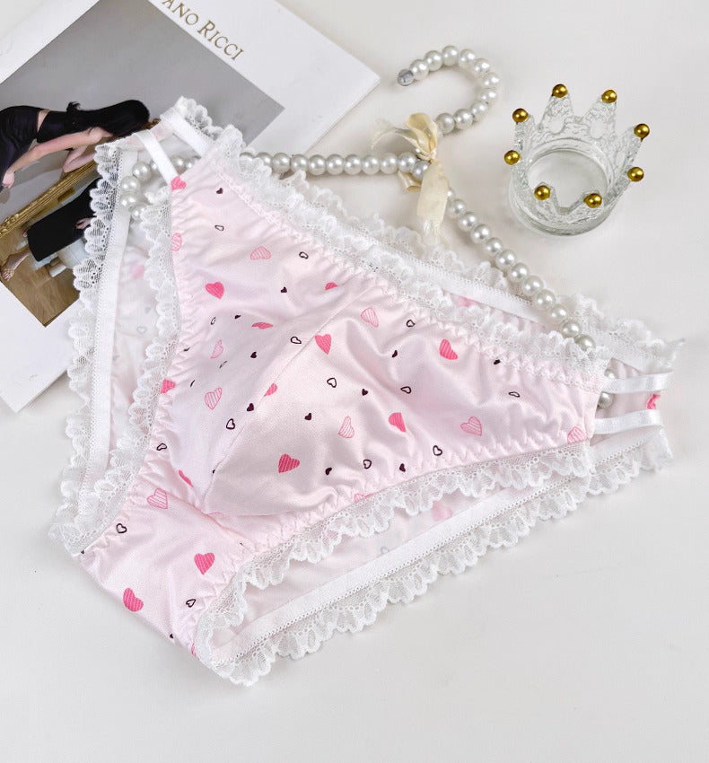Turn up the charm with our Sexy Strappy Lace Men's Panties. Featuring delicate heart patterns and lace trim along the waist and legs, these panties blend feminine allure with playful design. The cheeky waist straps add a flirty touch, while the soft, breathable fabric keeps you comfortable all day. Available in soft pink and crisp white, these panties are perfect for men who love mixing cute with sexy.